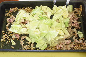 ② 豚肉を炒め8割がた火が通ったら、続いてキャベツを炒める