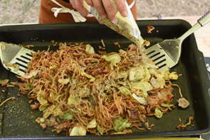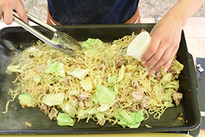 ⑤ ソースを適量かけて、麺や具材と絡ませるように炒める