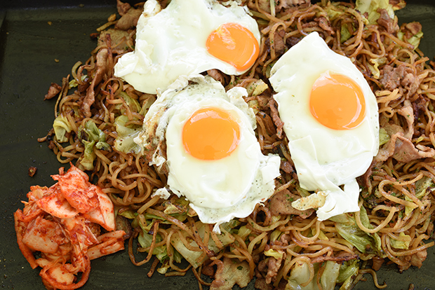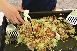 朝霧高原がある地元富士宮市の名物B級グルメ「富士宮焼きそば」に挑戦! 焼きそばの麺や肉かす、ソース、魚粉など、富士宮焼きそばならではの食材は会場入りする前のスーパーなどで購入できます。鉄板がなければフライパンでもOK。キムチなどトッピングしたり、食材など自分たち流にアレンジしても楽しいですよ。