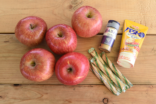 りんご 5個、スティックシュガー 3本、チューブバター 適量、シナモンパウダー 適量