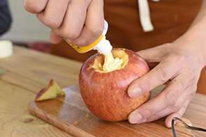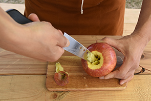 ① 果物ナイフなどでりんごの芯を2/3ほどくり抜き種を取る