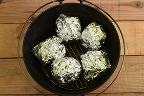 ④ アルミホイルで包んだりんごをダッチオーブンに並べる