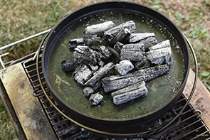 ⑤ ダッチオーブンを火にかける。蓋にも炭を置き上からも熱を加える
