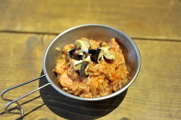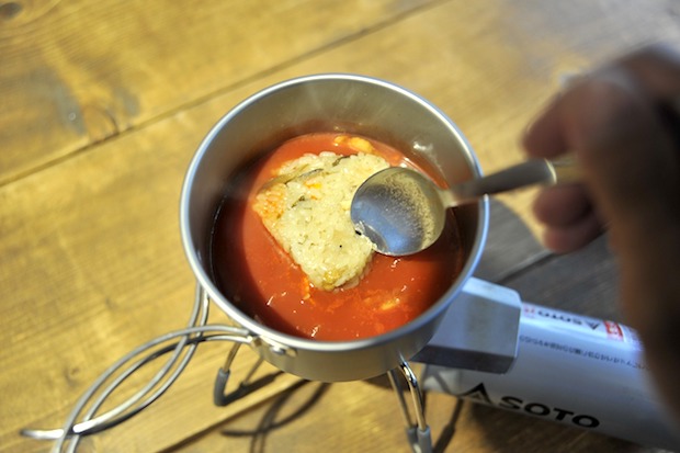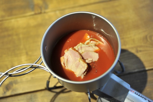 まずはスモークチキンとトマトジュースをコッヘルにあけて温めます。このとき一緒に「茸のまんま」を半分くらい入れてしまいます。