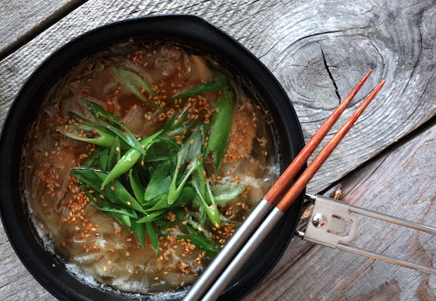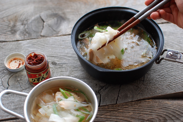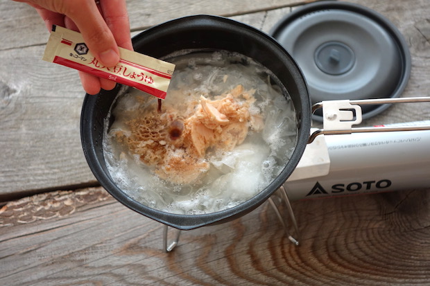 しみじみ簡単。アツアツが食べれるのも嬉しいですよね。このレシピ、作業が少なく、煮込み時間も2〜3分でよいので、寒〜い山での調理にちょうどいいのです。シンプルなので、ショウガを入れたり、ごま油で中華風にしたり、プラスワンでよりおいしくいただけます。