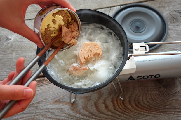 ストーブに火をつけ、ぐつぐつ沸騰したらツナを油ごと入れます。