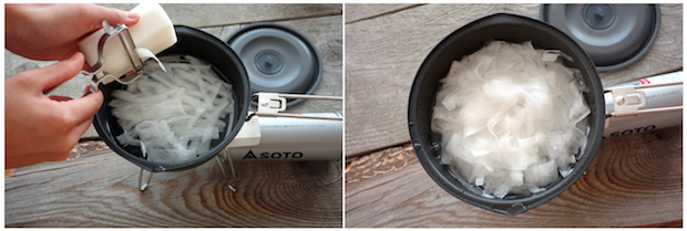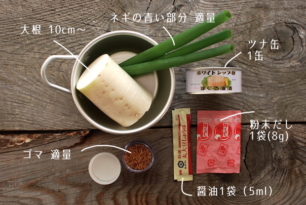 まずはコッヘルに水400ml(分量外)を入れます。そこに大根はピーラーで処理! ピーラーはまな板が必要なく、ひらひらの野菜は火の通りも早いので時短にも。コッヘルの隙間に忍ばせる価値ありですよ。