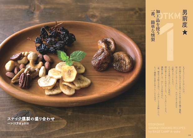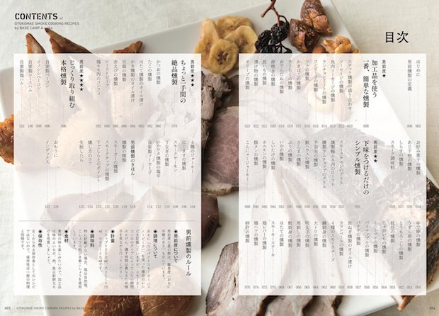 男前度★★★「ちょっと一手間の絶品燻製」では、ホタテ燻製のオイル漬け、鶏もも肉のコンフィなど、響きだけで杯が増えてしまいそうなレシピが8つ。「じっくり取り組む本格燻製」の★★★★になると、王道の自家製ベーコンやスモークサーモン、いかワタ燻製の塩辛などが登場し、あぁウィスキー?いや〜日本酒でしょ!などと、想像するだけでスモーキーな香りが鼻腔を抜ける悶絶レシピが連発されています。