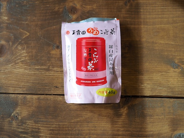 写真は梅こんぶ茶だけどただのこんぶ茶でもOK。お徳用が写っていますがスティックで小分けされたものも売っているのでそちらも便利だ。