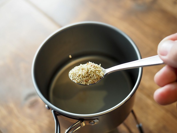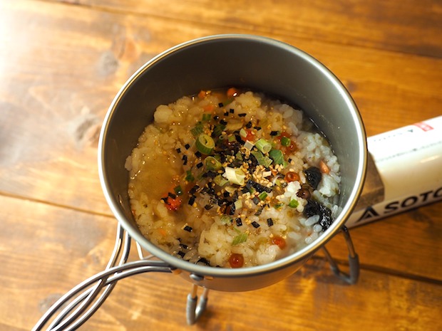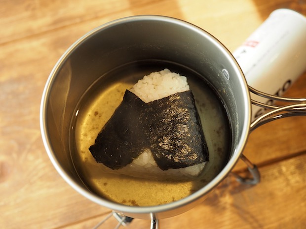 まずはコッヘルに200mlほど水を入れて、梅こんぶ茶を加えて沸騰させて……火を弱火にしたら鮭おにぎりをドボン!