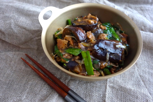 そこへなすを加え、油が足りなければ随時足して炒めます。