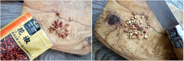 今回の本格的な味の決め手はこちらの「花椒」。香りをより出すためにナイフなどで砕いてから加えます。