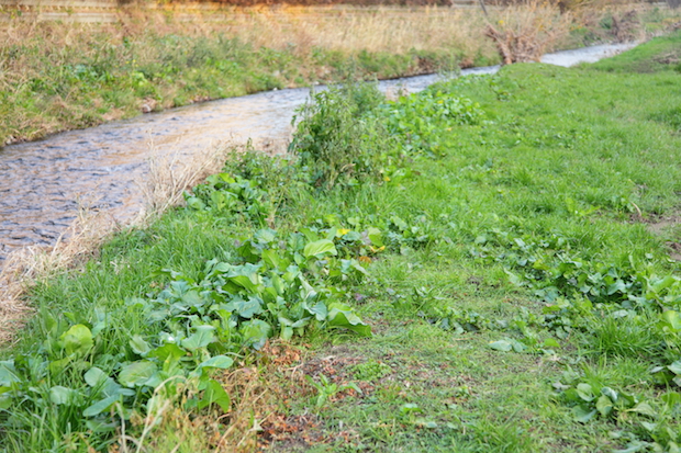 水が伏流するときに地熱を蓄えるのか、裏側の春は河原のなかでも水際で強く感じられる。青い草地を歩いて行くと、いかにも食べられられそうな株を発見。ピリリと辛い風味のセイヨウカラシナだ。春は上に向かってぐいぐい茎を伸ばすが、今の時期は地面に這いつくばるように葉を広げる。