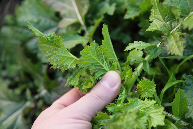 少しかじってみるとカラシナはその名の通り辛く、アブラナは白菜の外側の葉っぱをよりエグくしたような味が広がる。採集はどちらもまだ柔らかい新芽を摘み取る。