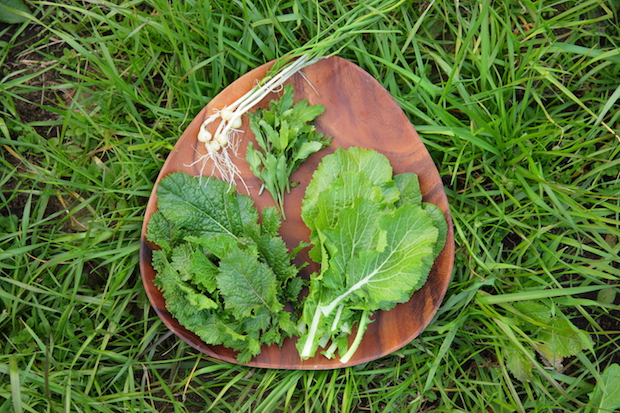 収穫物。左下のギザギザした葉がセイヨウカラシナで右隣がセイヨウアブラナ。上はノビルとクコ。