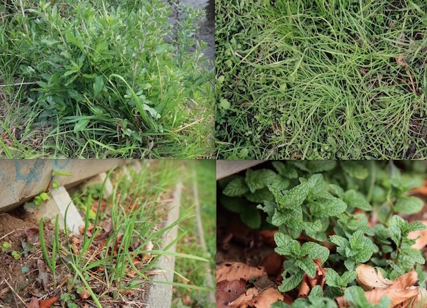 左上から時計回りにクコ、ノビル、ミント、ニラ。都市近郊の河原でよく目にする面々だ。