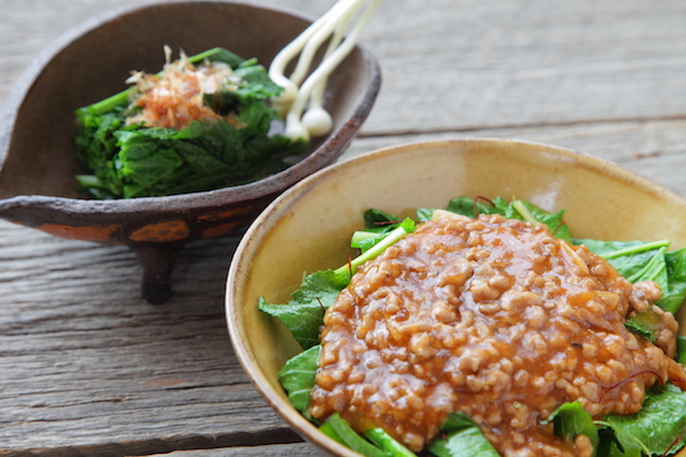 家に帰ってささっと作ったのはアブラナとひき肉の炒め物とカラシナのおひたし。ノビルは少量をさっとゆがいた(ノビルは食べ過ぎると頭痛や胸焼けを起こすことがある)。