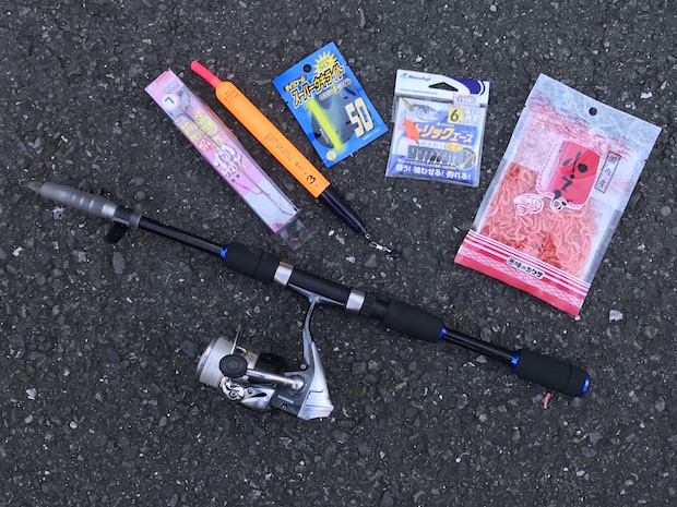 用意するのは干しエビとパックロッドとトリック仕掛けとイカの泳がせ仕掛け。5000円以下で一式がそろう。重量も全部合わせて500g以下だ。