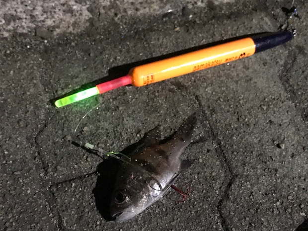 餌を確保したら今度は仕掛けをイカ用に交換。釣った魚をイカ仕掛けにつけて、発光体を付けたウキで泳がせる。電灯があり、新鮮な墨の跡がある岸壁ならまずイカがいる。