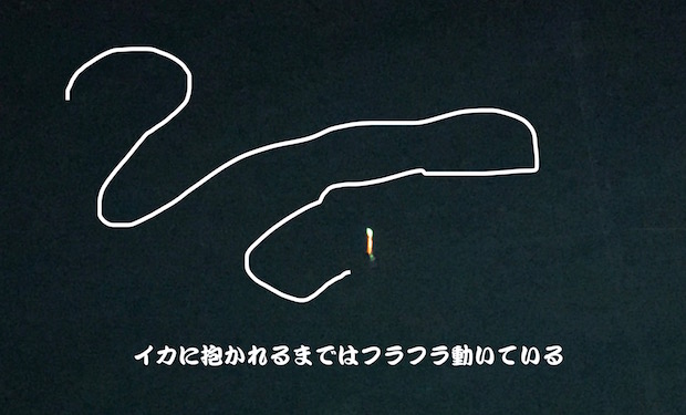 イカが魚を抱くと、強い意志を持ってウキが滑り出す。イカは明るい電灯の周辺を離れて、暗いところでゆっくりと食べたいのだ。ウキが走り出したらそのままイカを送り出して、しばらく餌を食わせてやる。