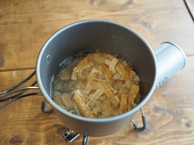 このように「揚げ」を具や調味料として使えば、単純におにぎりとして食べるだけ以上に、山ごはんとしてのバリエーションが増えるというわけです。冷える時期は温かい食事もうれしいし、油と甘みをつけた揚げはエネルギー補給にもいいと思う。