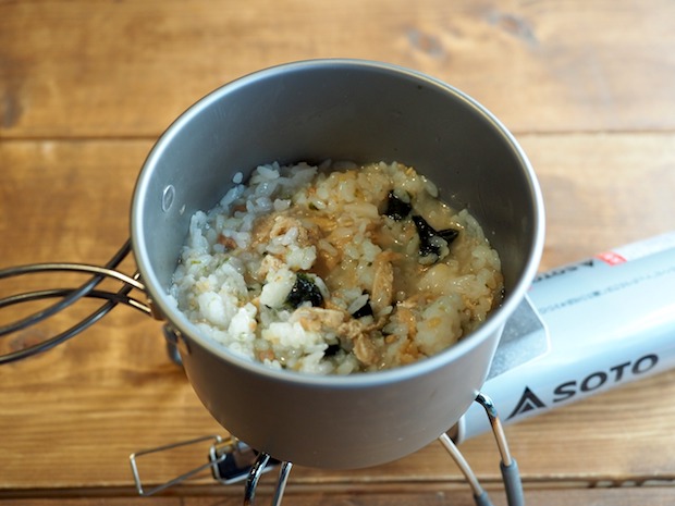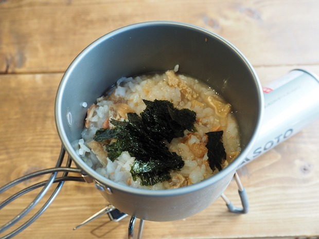 そしたらあとはコッヘルに100㏄ほどお湯を沸かしておにぎりをドボン! このときの鮭おにぎりはいつもの通り海苔を外しておいてね。