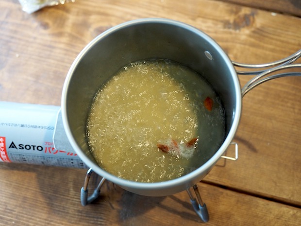 まずは水を50㏄ほど汲んでにんにく、しょうがのチューブを5㎝程度と鶏がらスープとクコの実を4個ほど入れて沸騰させます。