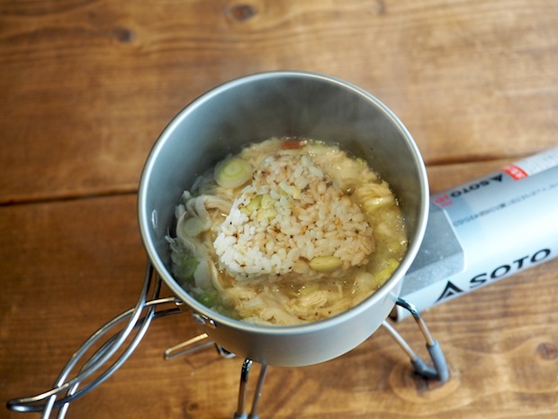 よくほぐして、もう一回沸騰するぐらいになったらおにぎりを入れて……。