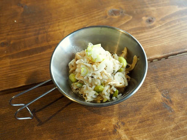 鶏肉の量が多いのでおにぎり一個でもかなりのボリューム。枝豆やもち麦のプチプチ感がおいしいですね。水分量はもっと多くしてスープっぽく食べてもいいし、水分少なくしてリゾット風でもOK。サムゲタン風になる決め手は困るくらいに効かせたにんにくとしょうがで、薬膳的な味わいが体を温かくしてくれる優しいおいしさです。