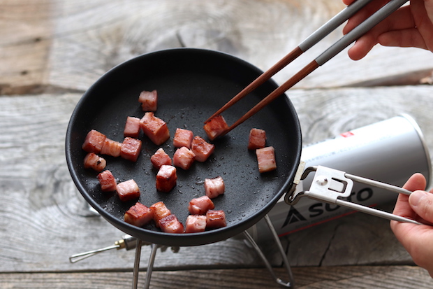 フライパンで1cm角に切ったベーコンをこんがり焼いていきます。厚切りベーコンの方が食べ応えもあっておいしく仕上がります!