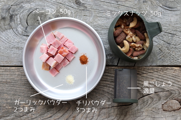 「これは、手が止まらない! 簡単な一手間でこんなに満足感のある1品になるなんてね。ベーコンの旨みがナッツの旨みとあいまって、ピリッとした辛味も最高。このつまみに合うお酒はウイスキー! スモーキー風味がいいな。早めにテン場について、夕陽を眺めながら最高の景色と最高のお酒とこのつまみで一杯!幸せな時間だ」