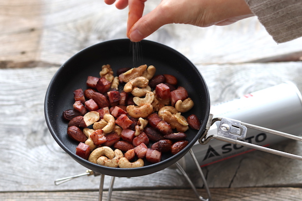 【好評連載】山好き料理家カノウヒナタの「山つまみ12ヶ月」 第5回 ナッツとベーコンのスパイシー炒め(ウィスキーを添えて!)