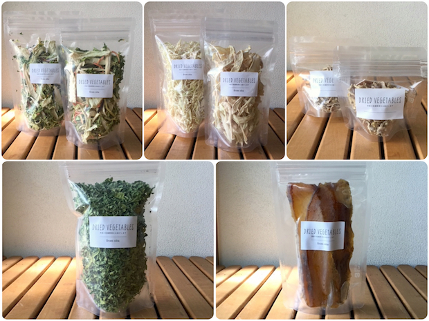 白菜や大根、にんじんなど5種類の旬の野菜を封じ込めた「季節の野菜セット」(左上)、「干し大根・千切り大根」(中央上)、「乾燥新しょうが」(右上)、「乾燥大根葉」(左下)、「紅はるかの干しいも」(右下)など。