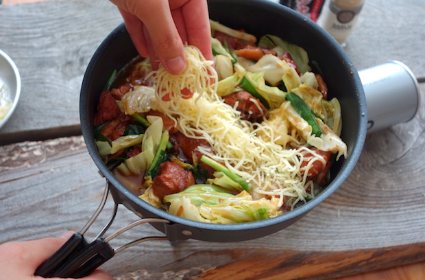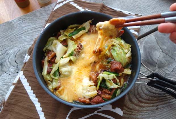 山好き料理家カノウヒナタの「山つまみ12ヶ月」 第7回 焼き鳥缶でチーズダッカルビ(韓国焼酎を添えて!)