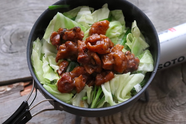 「うまいうまい。簡単お手軽にダッカルビ風! タレ味を生かして、コチュジャンを加えるだけでここまで再現出来るとは……焼き鳥缶恐るべし。“ソジュ、ジュセヨ〜〜(焼酎ください)”なんて、山にはなかなか持っていかないかもだけど韓国焼酎とかで合わせたくなるね。もちろんビールも最高。コチュジャンの旨味、辛味、チーズのコクと、野菜のシャキシャキの食感が食欲を倍増させるから、お酒でなくてもご飯にガサッとかけてがっつりもよさそう!」