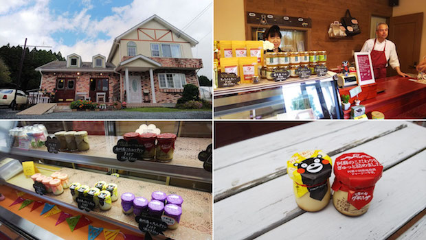 かわいい外観の建物。南阿蘇は案外オシャレな建物が多く立ち並ぶ。ショーケースはもちろんプリンのみ。瓶に入ったプリンはくまもんがかわいいクリーミープリンと赤いこだわりプリン。気さくなご主人が親切にプリンの説明をしてくれました。