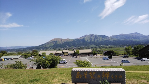 その景色を一望できるのが「道の駅 あそ望の郷くぎの」です。道から一段下がったところに配置されており、建物をぬけると一面に阿蘇山が見渡せるようになっています。