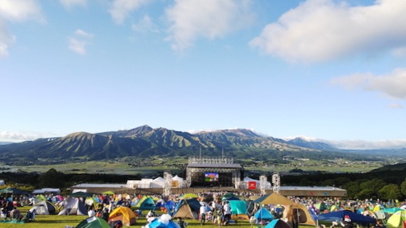 阿蘇ロックフェス会場の野外劇場アスペクタからの阿蘇山。阿蘇五岳がくっきりみえる。