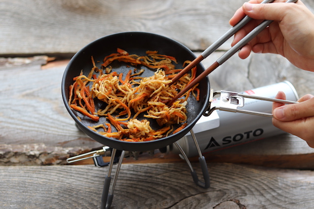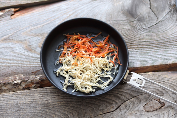なお、しょうゆとニンニクというシンプルな味付けですが、桜えびの塩っけや旨味、乾燥野菜から出る出汁で味わい深い一品になっています! 山ではなるべく少ない調味料で作れる方がよいので、食材の持つ旨味や塩分を生かして作れるレシピは重宝しますね。