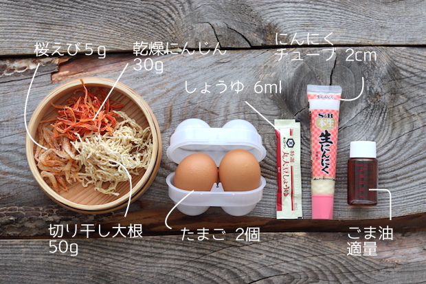 シェラカップなどの器の中にたまごを割り、いったん桜えびと炒めた切り干し大根、乾燥にんじんを加えて混ぜる。