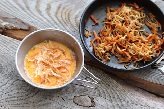 まず、食感がいい!! シャキシャキの切り干しと香ばしい桜えび。チリソースの甘辛さとネギも合っていて、オムレツとの相性も抜群。酒のつまみだから、もっとニンニクと醤油を効かせてもいいね! 飲むのはやっぱりビールかなー。ビールだなー! 料理の手順は少し多いけど、荷物にならなそうだし、山つまみにピッタリだ。桜えびの代わりにツナとかタラコとかアレンジもできそうだし、今度山で作ろう!