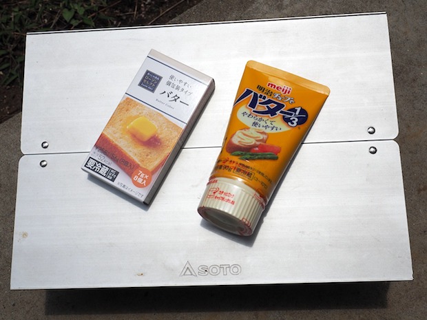 それから調味料はS&Bの青じそチューブ。これがなかなか使えるんです。バターはコンビニでしかこのサイズは手に入らないと噂の明治さんのチューブでバター1/3。ローソンセレクトだと個包装のミニサイズバターも売っています。どちらでも便利な方を使いましょう。ただし、バターは漏れないようにピルケースなんかに入れて持ち運ぶことをおすすめするよ。