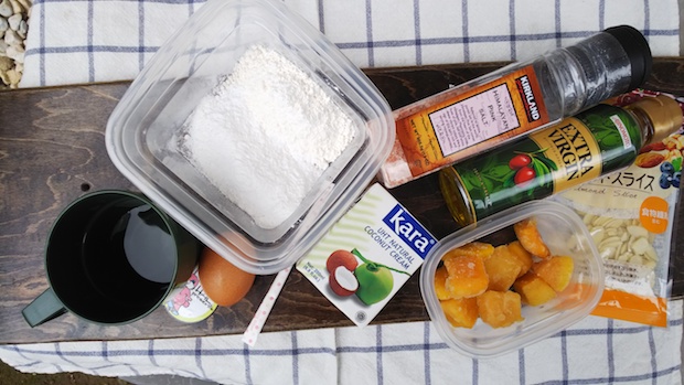 冷凍カットマンゴー5個、アーモンド(ココナッツ)20g、薄力粉30g、卵1個、砂糖6g、ココナッツドリンク80g、オリーブオイル少々、塩少々