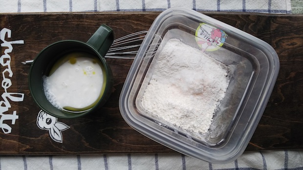 まずは生地をつくります。簡単です。アーモンド(ココナッツ)以外の材料をすべていれ、まんべんなく混ぜてください。ジップロックコンテナで前日につくっておき、当日持って行っても大丈夫。必ずよくかき混ぜてから使ってください。