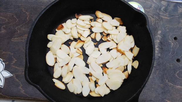 スキレットをあたため、そこにアーモンドをいれ、色がついて香りがしてくるまで炒めます。もちろんココナッツでもオッケーです。別のお皿に取り出しておきましょう。