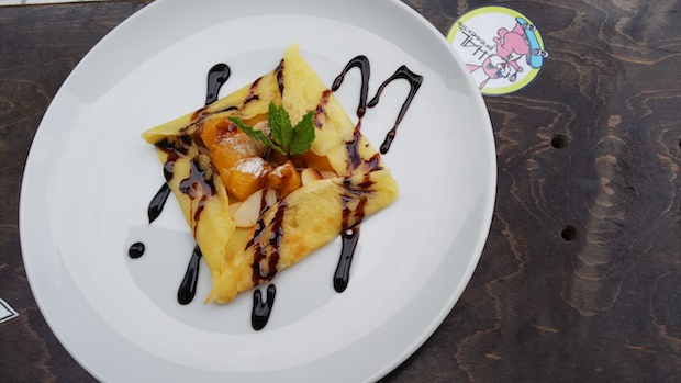 色づいたら完成です。お皿に移して盛り付けしましょう。HALはチョコレートソースと粉糖、ミントの王道デコレーションです。みなさんお好きなトッピングをどうぞ。
