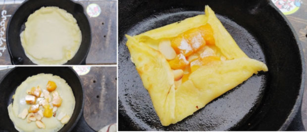 スキレットに薄く油またはバター(分量外)を敷いて、よく混ぜた生地を薄くいれます。クレープの要領です。薄いほどパリッと仕上がります。真ん中にマンゴーとアーモンドをいれて、四隅を折りたたみ、くっつくまでおさえつけます。