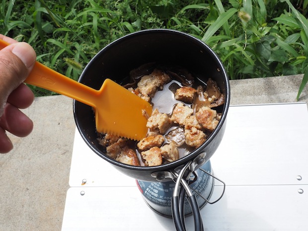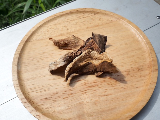 さて、その乾燥ポルチーニを食べやすいサイズにポキポキ割ってコッヘルに入れて……。