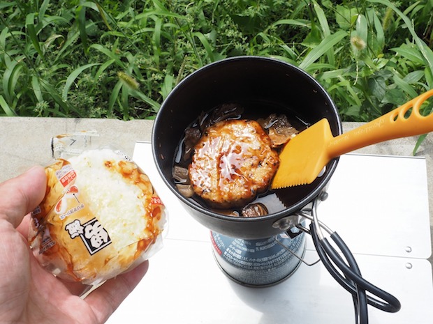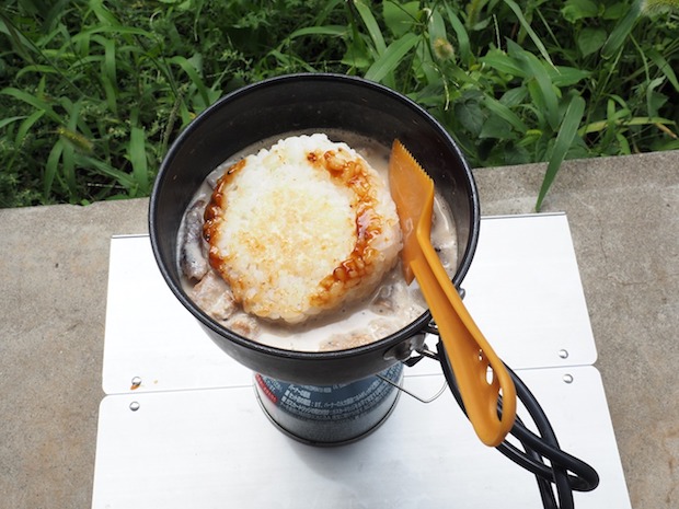 ひと煮たちさせたらおにぎりを準備します。このおにぎりは簡単に具だけ取り出せます。つくねだけコッヘルへ入れて。