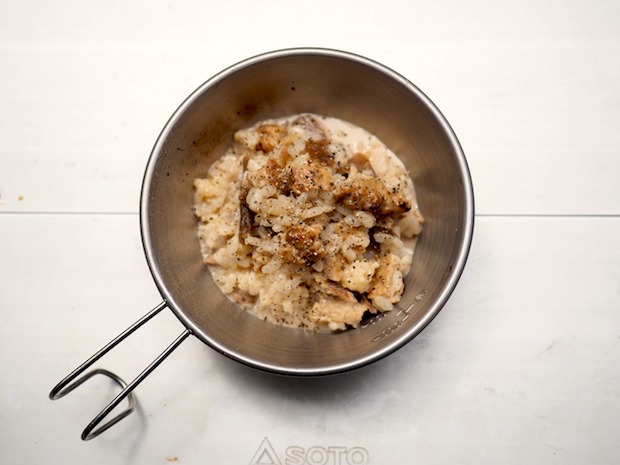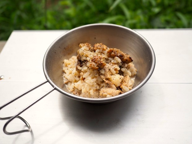 ポルチーニは「香りの女王様」とも言われるだけあってこのリゾットは香りがとてもいい!! 山ごはんにしては最高に贅沢だ! そしてつくねの照り焼き味の甘みと牛乳との相性もいい。飛び道具は使ったものの、とても秋らしい一品になった。